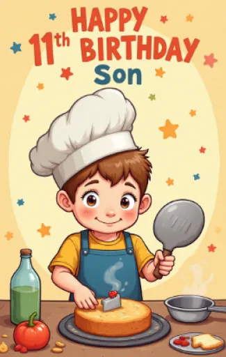 A birthday card for an 11 year old boy who enjoys cooking, with a message 'Happy 11th Birthday Son' in a whimsical cartoon text