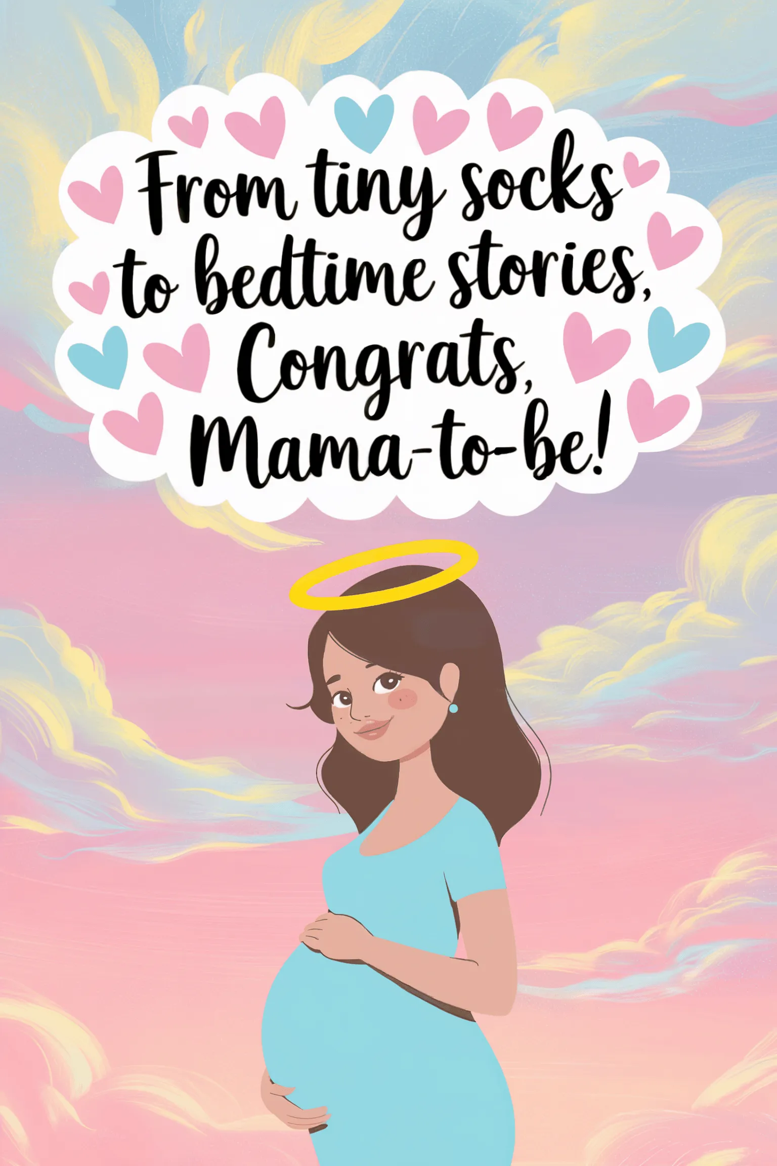 A cute illustration of a pregnant woman with a small baby bump and a halo over her head. The text "From tiny socks to bedtime stories. Congrats, Mama-to-be!" is written in a cloud of pink and blue hearts. The background is a pastel-coloured sky with fluffy clouds.