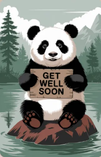 A get-well-soon card. Illustration of a panda holding a sign that says "Get well soon". The panda is sitting on a rock in a serene mountain lake. The background contains tall trees and a clear sky.